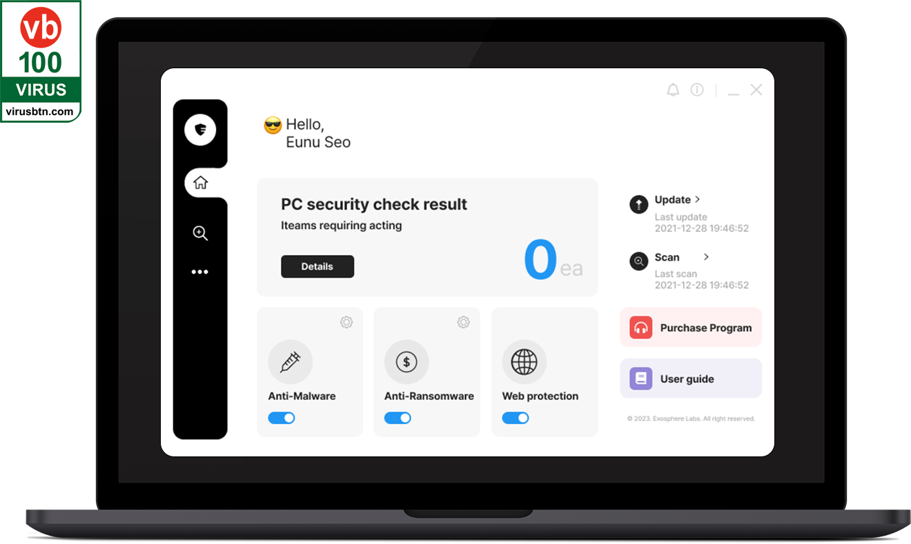 Exosphere protects against all critical attack vectors including advanced malware, ransomware, phishing, and insider threats. It combines this with the most complete layers of protection in the industry including PC healthcheck, web filtering, data loss prevention.